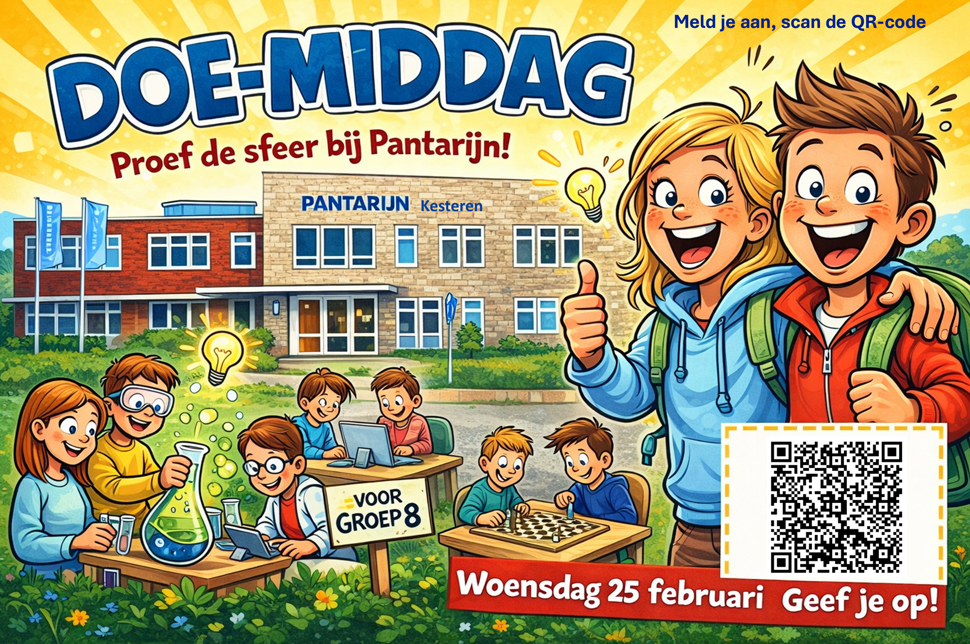 Zit je in groep 8 en twijfel je nog aan je schoolkeuze? Of heb je ons Open Huis gemist? Meld je dan aan voor onze extra Doe-Middag op woensdag 25 februari voor groep 8. Dit kan via onderstaande QR-code of Meld je hier aan