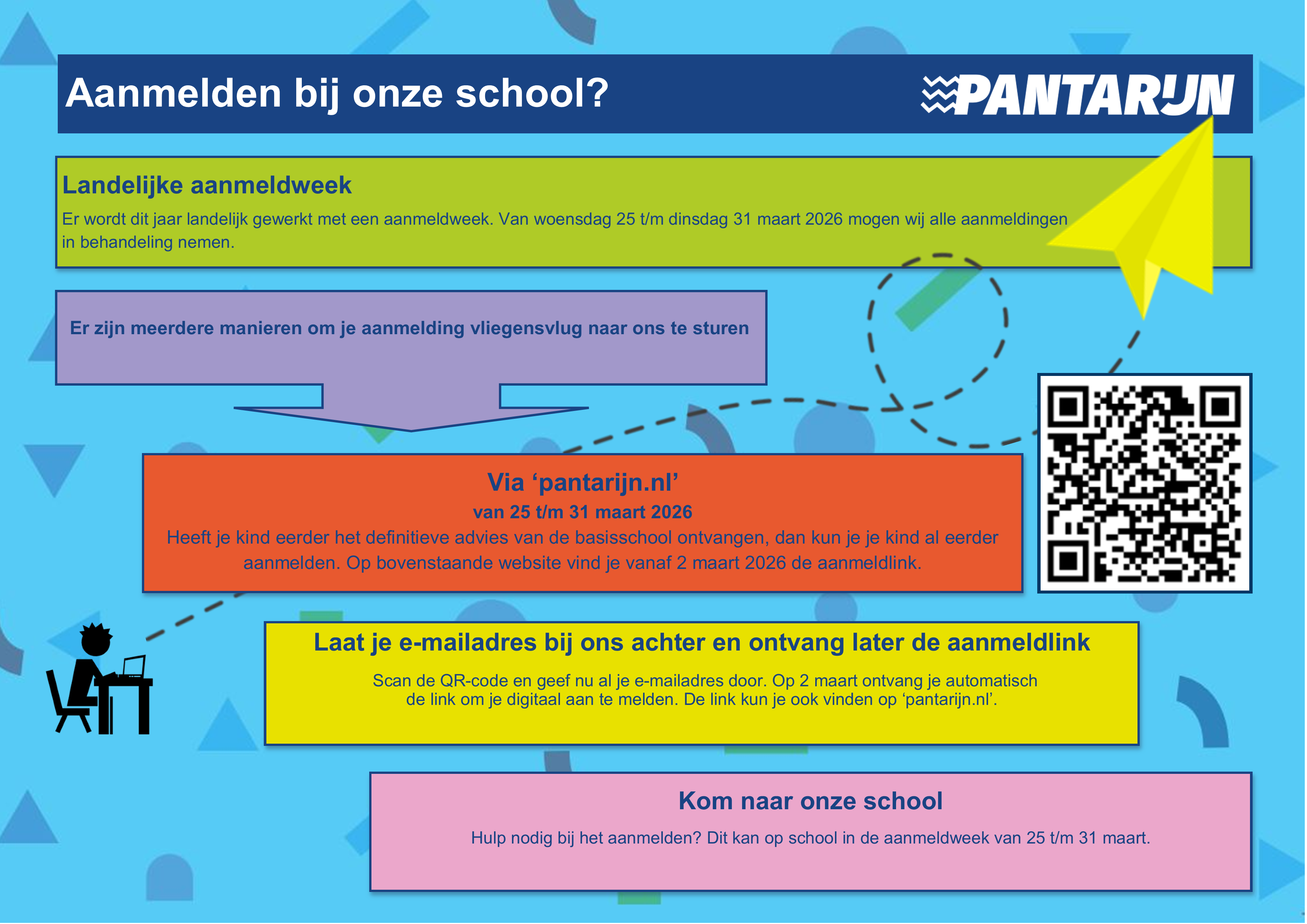 Er wordt voor schooljaar 2026-2027 landelijk gewerkt met een aanmeldweek. Van woensdag 25 t/m dinsdag 31 maart 2026 mogen wij alle aanmeldingen in behandeling nemen. Heeft je kind eerder het definitieve advies van de basisschool ontvangen, dan kun je je kind al eerder aanmelden. Op deze website vind je vanaf 2 maart 2026 de aanmeldlink.