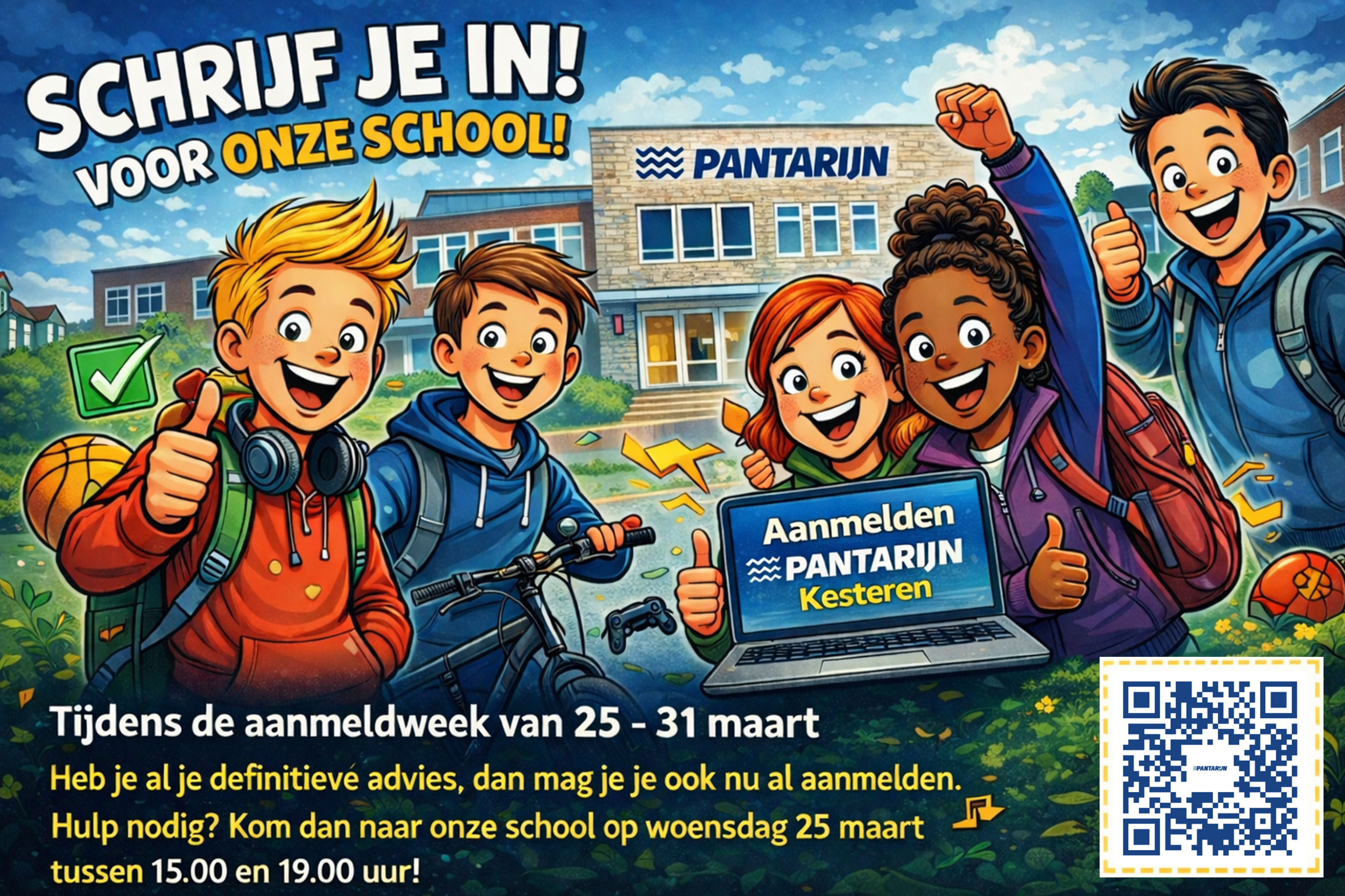 Hulp nodig bij het aanmelden? Dat kan op school tijdens onze schooluren in de aanmeldweek van 25 t/m 31 maart en op woensdag 25 maart tussen 15.00 en 19.00 uur.